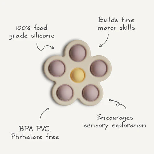 Made with little hands in mind, our flower press toy encourages sensory exploration and the development of motor fine skills with its simple design and soft colors. Featuring food grade silicone and a BPA-free plastic frame, children will tap into learning as they press the bubbles and hear a gentle pop.