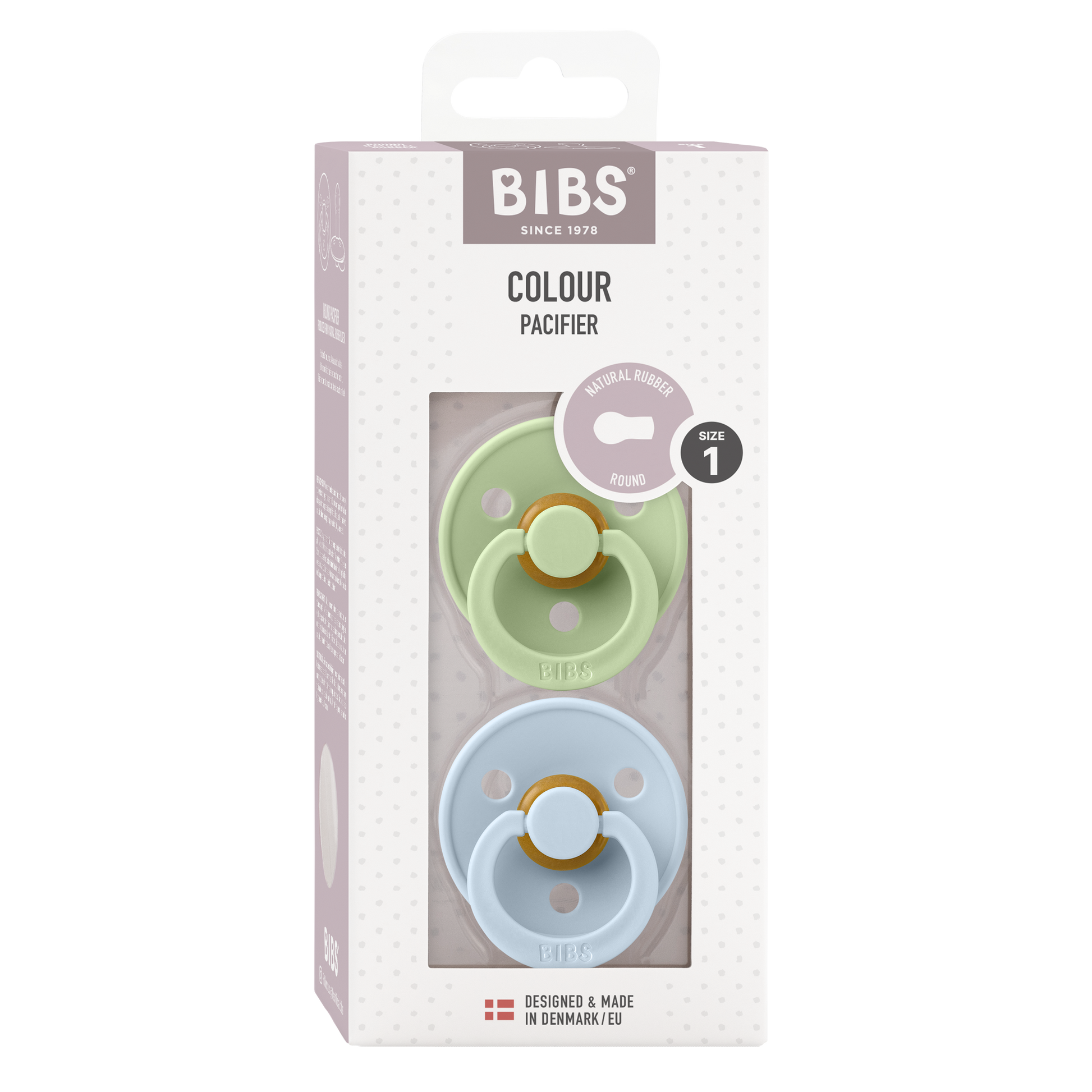 Our Colour pacifier is the original BIBS pacifier and has been on the market for over 40 years. It has the signature round BIBS shield with three vent holes and round BIBS engraved handle ring. The nipple is round and resembles the shape and size of the mother's breast to provide comfort to your baby.